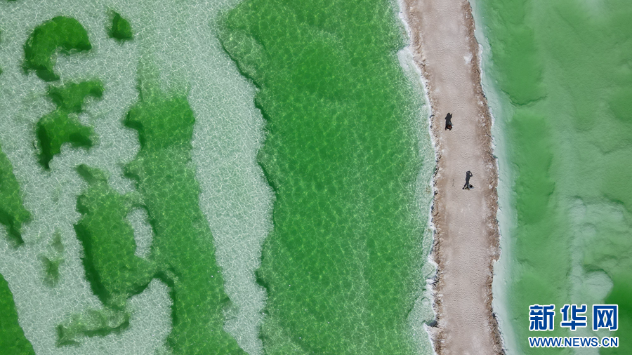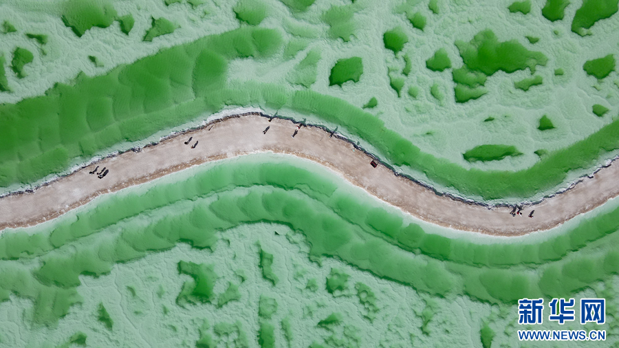 白色的盐晶沿着湖岸线分布,形成独特的纹理。