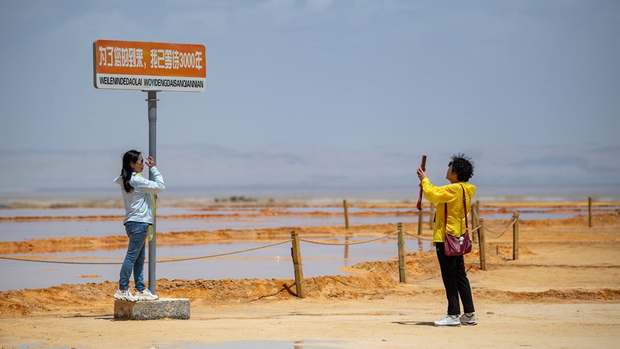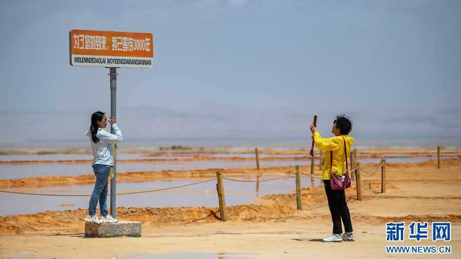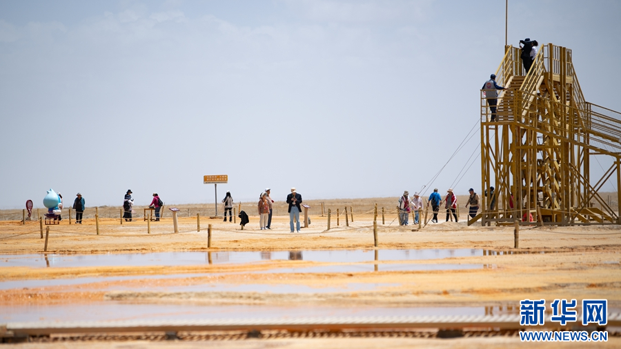 5月19日,专列游客在茫崖市翡翠湖景区游玩。