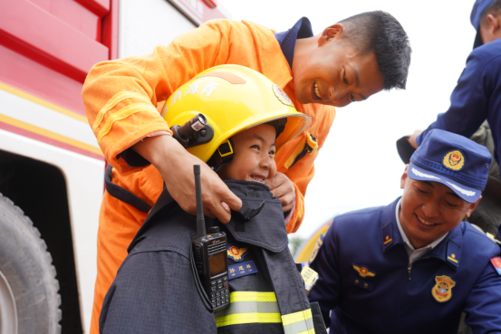 9月3日,果洛藏族自治州消防救援支队宣传员在玛沁县大武幼儿园开展消防安全开学第一课,图为小朋友体验穿着灭火战斗服。(青海省消防救援总队供图)
